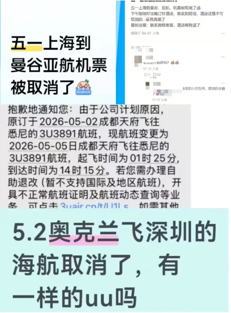 有不少网友表示,自己早早订好的“五一”航班突然被取消,只能无奈改签或重新安排行程,直呼 “心态崩了”。